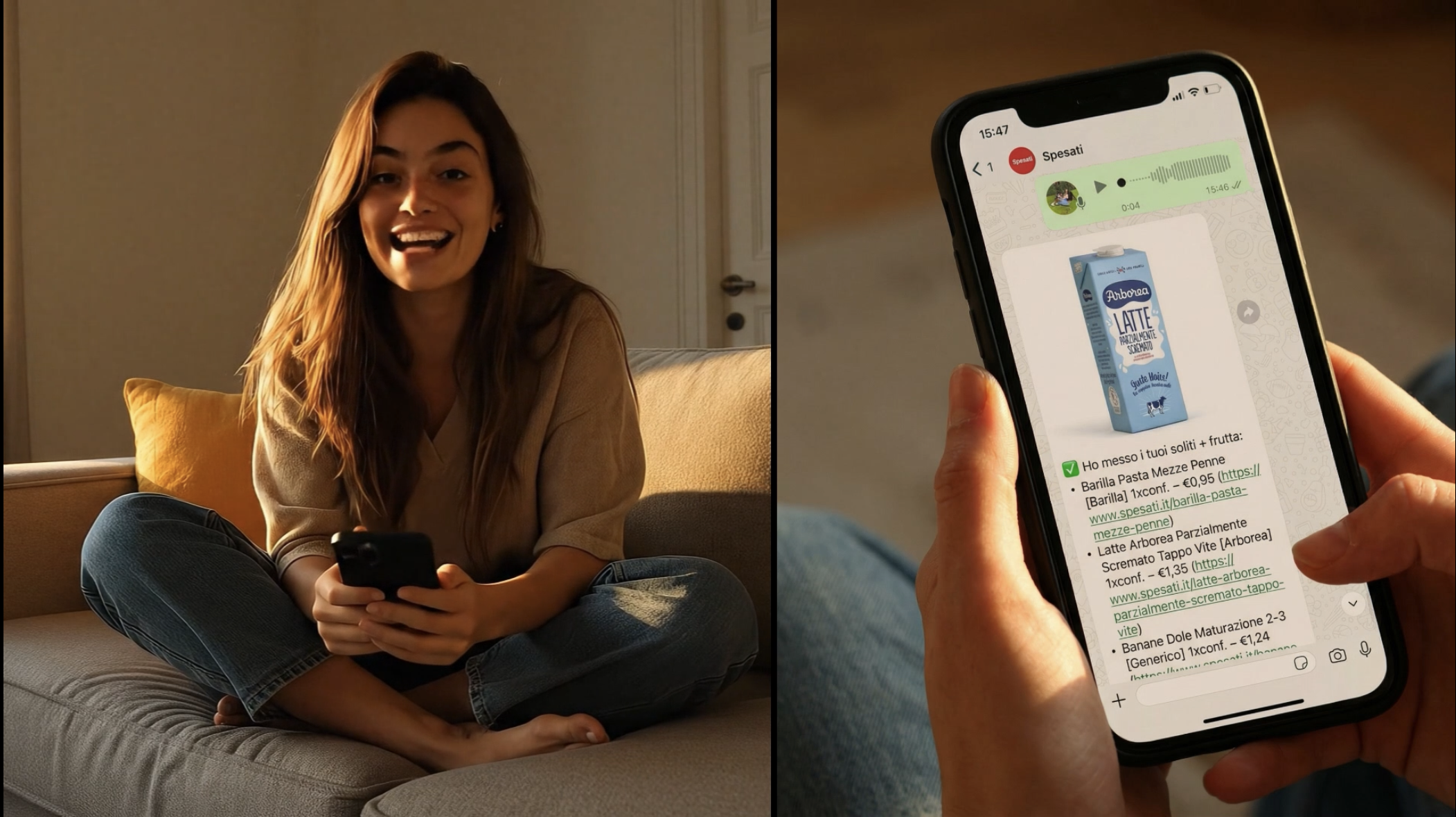 Il modo più semplice di fare la spesa oggi. Parli su WhatsApp, Spesati capisce, ricorda e prepara la spesa per te.